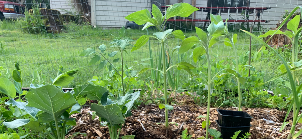 2022– I did not grow sunflowers in 2023 but I had one successful Mammoth Sunflower grow. I started them a six pack, and then transplanted five of them along the fence (not in a garden bed) and one in the one of the rows. The ones planted along the fence only got three or four feet tall and the head was only a couple inches across. But the one growing the bed grew six to seven feet tall and the head was about one foot across. I saved some of the seeds, but failed to plant them in 2023.