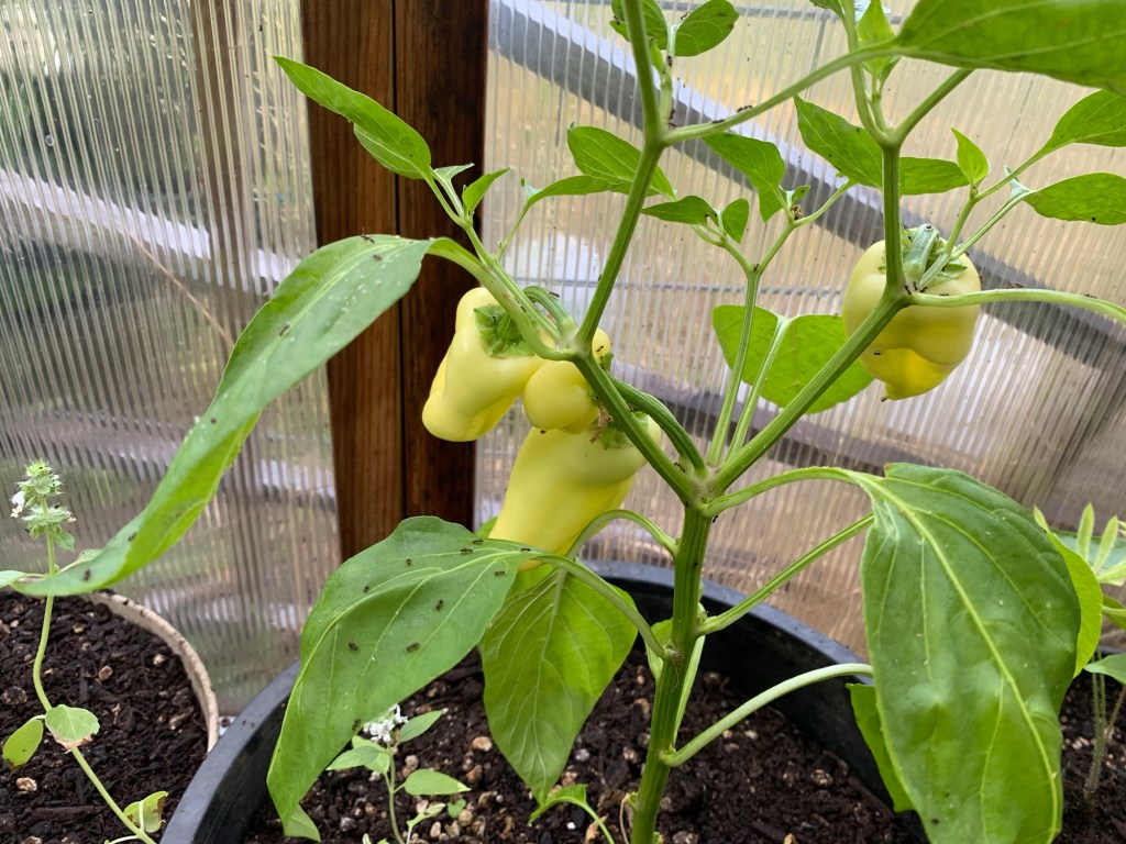 July 13- The Gypsy Sweet has three ripe peppers and the ants seemed to have moved in… The plant itself doesn’t seem to have grown much, and hasn’t put on other flowers yet. The other peppers have grown some, but the only other one that has flowers, is the one that was transplanted into the 6” pot. I will say, the greenhouse doesn’t get enough sunlight in its current position, and everything seems to be nitrogen deficient.
