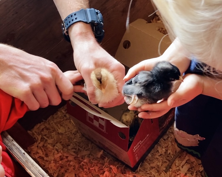 Amazingly, the three remaining chicks looked a little roughed up, but were otherwise uninjured. They stayed huddled pretty close together for the rest of the day, poor babies must’ve been scared to death! PJ gave them some extra clover and greens from the yard to try to help them feel better (and she said we should eat the cats lol).